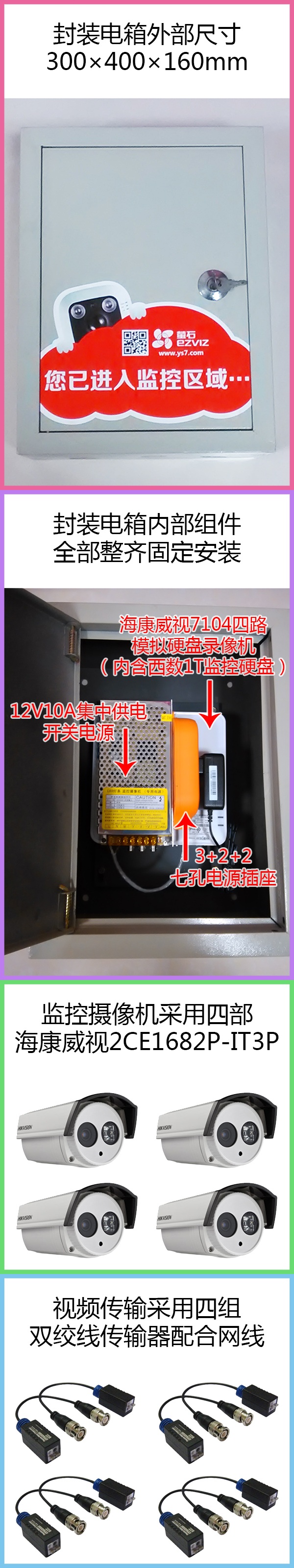 四路監(jiān)控套裝,內(nèi)含7104四路模擬硬盤錄像機一臺、西數(shù)1T監(jiān)控硬盤一塊、2V10A集中供電開關(guān)電源一個、3+2+2七孔電源插座一只、400×300×160mm電箱一個、監(jiān)控攝像機四部、雙絞線傳輸器四組、12V電源公頭四支、純銅網(wǎng)線50米及攝像機支架四支,僅售人民幣1299元,徐州市三環(huán)路以內(nèi)1799元上門包安裝,另加700元可得19寸顯示器及顯示器墻面掛架一套。